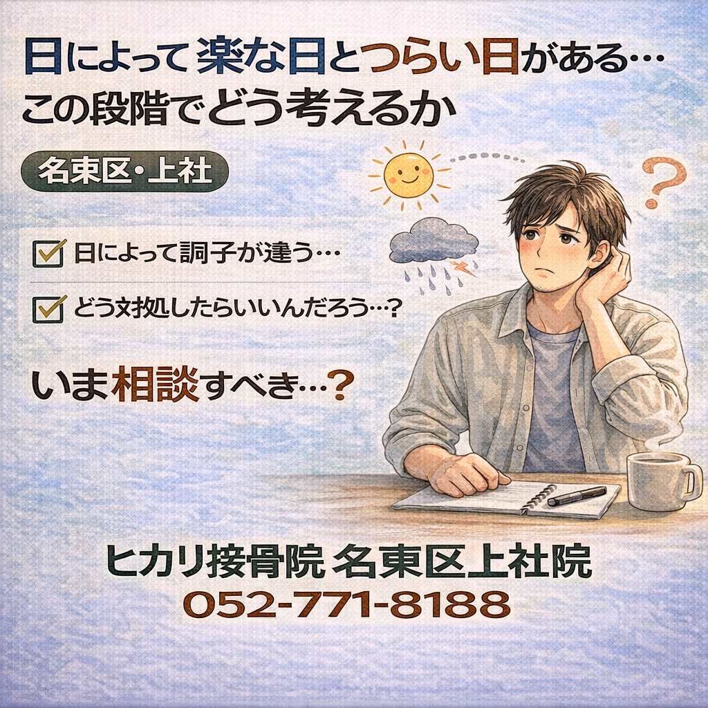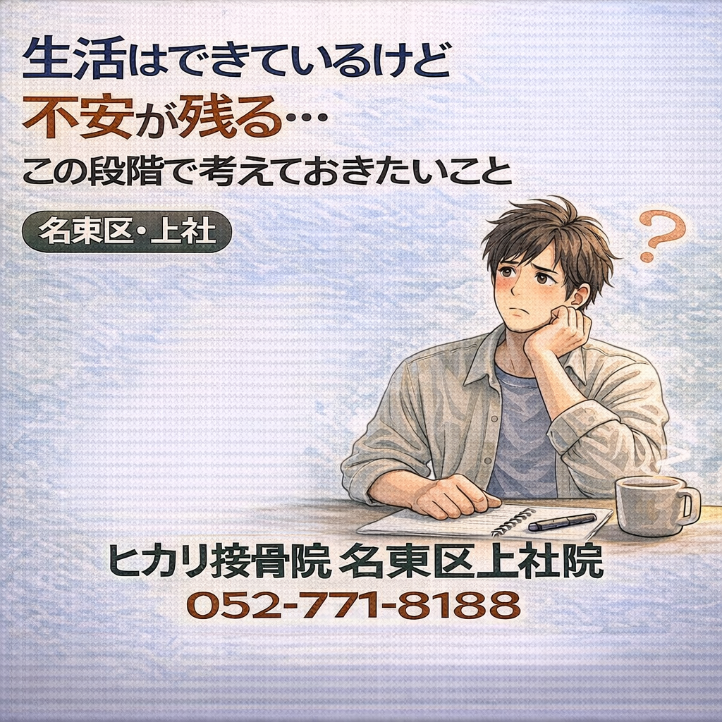 交通事故後、日常生活は送れているものの、違和感や不安が消えず判断に迷う方もいます。名東区・上社周辺でも多い段階で、今すぐ決めなくても、今の状況を整理してから次を考えるという進め方があります。