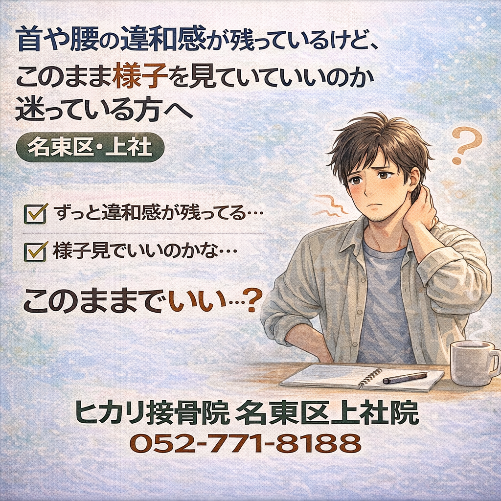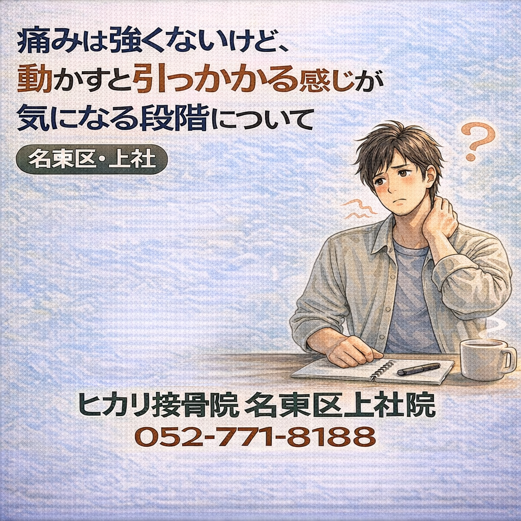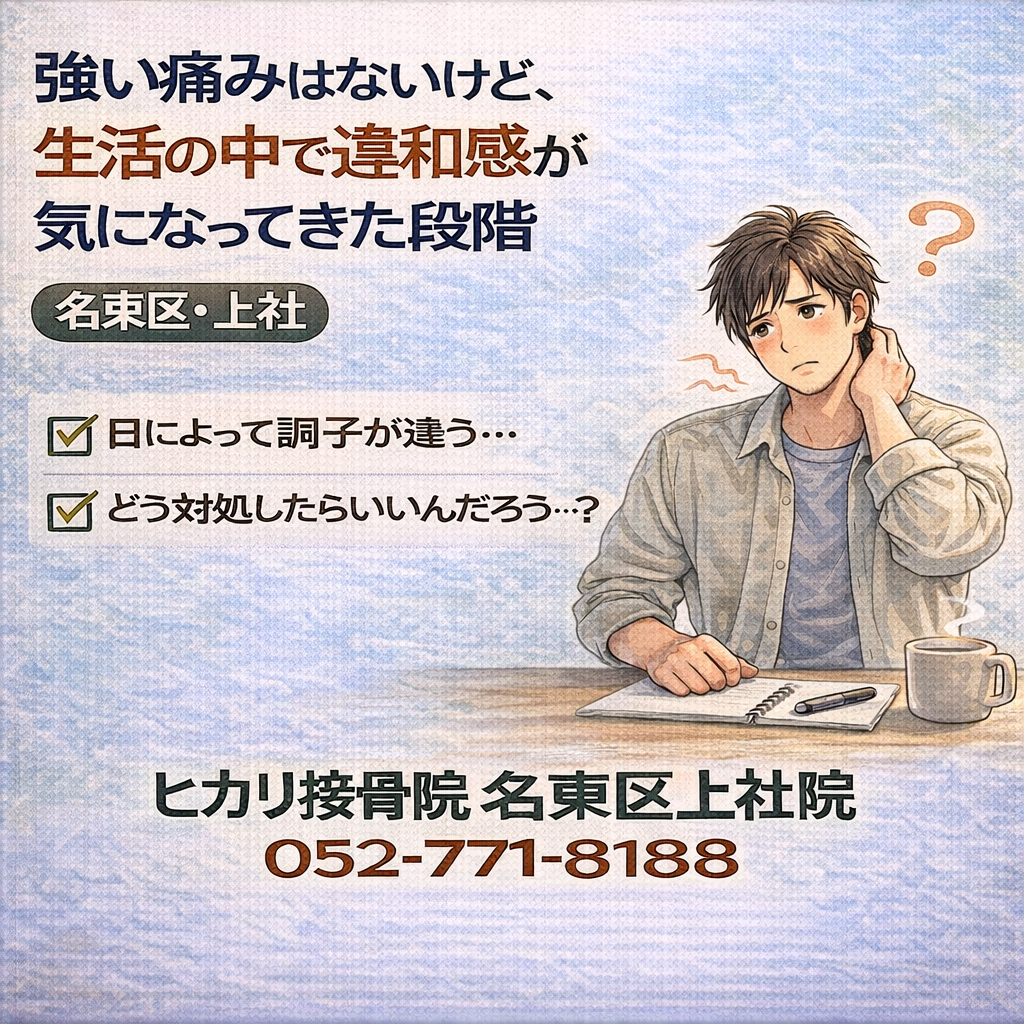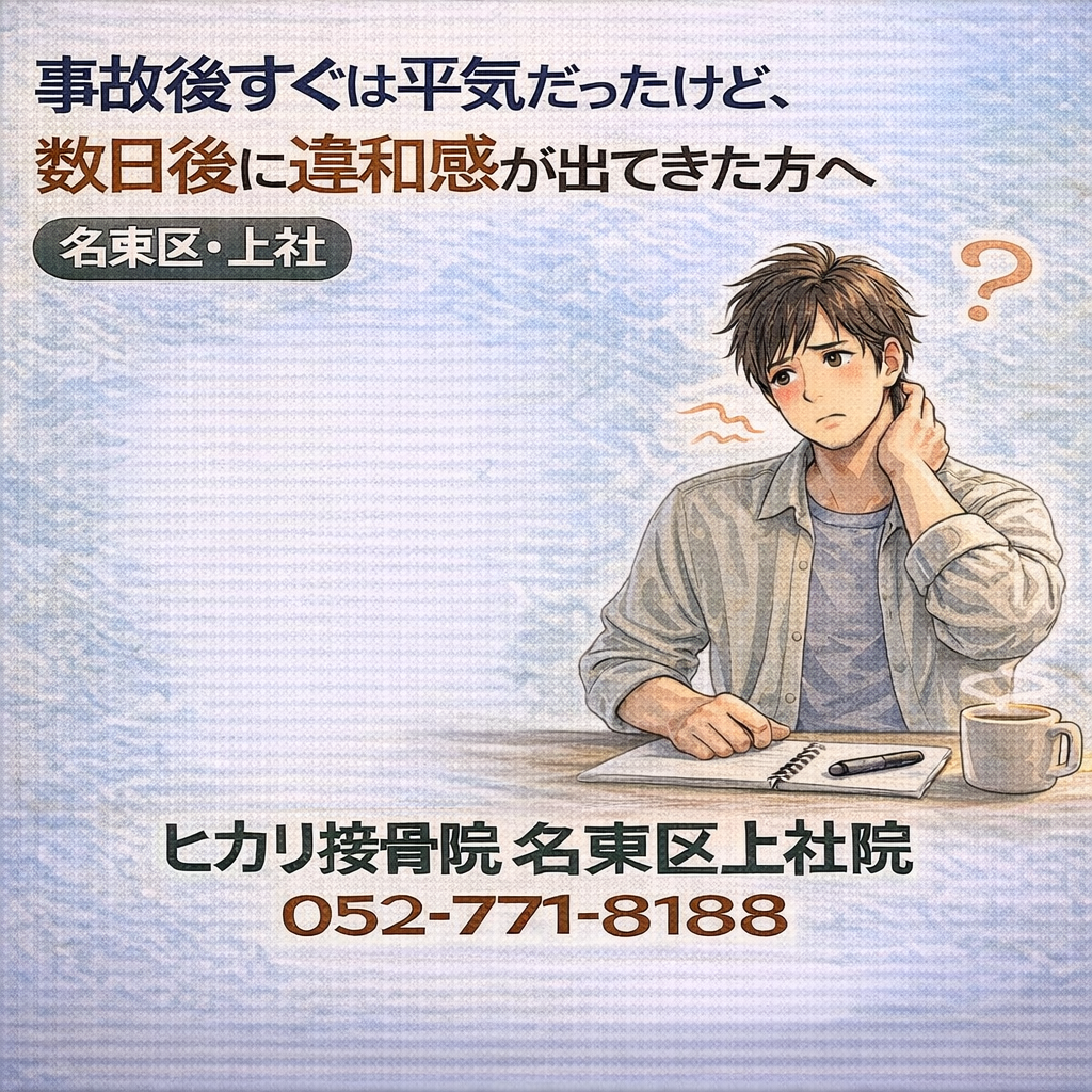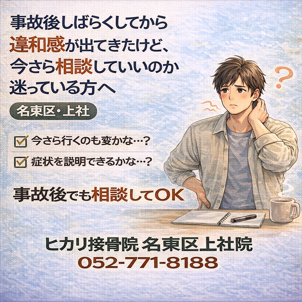 強い痛みはないものの、日常動作の中で引っかかるような違和感が気になり始めた段階についてまとめています。名東区・上社周辺で、事故後の体調変化に判断を迷っている方の参考情報です。