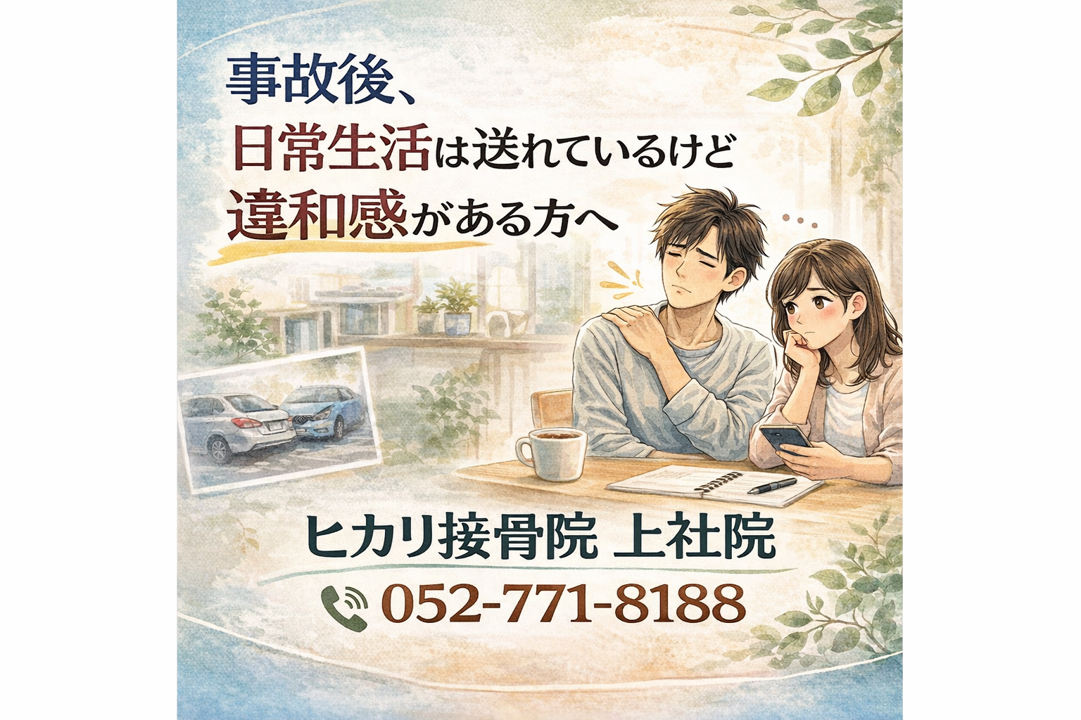 交通事故後、保険会社とのやりとりに戸惑い迷う方もいます。名東区・上社周辺でもよくある段階で、すぐ施術を決めなくても、まず状況を整理してから次の判断を考えるという進め方があります。