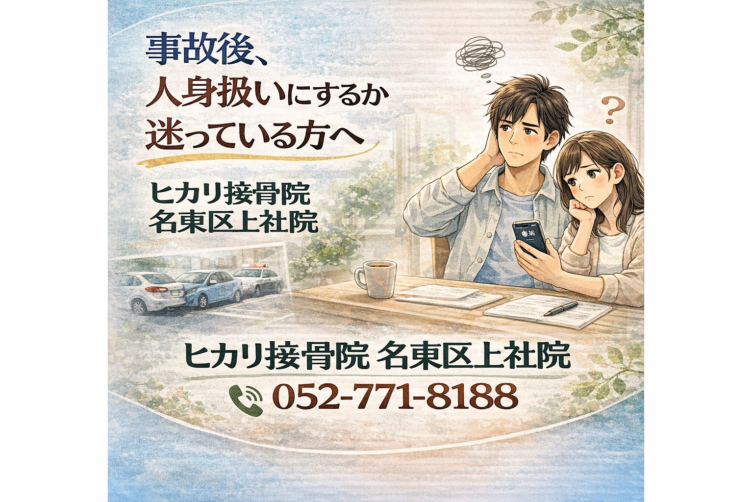 交通事故後、症状は軽いものの人身扱いにするか迷う方もいます。名東区・上社周辺でもよくある段階で、すぐ施術を決めなくても、まず状況整理から次の判断を考えるという進め方があります。
