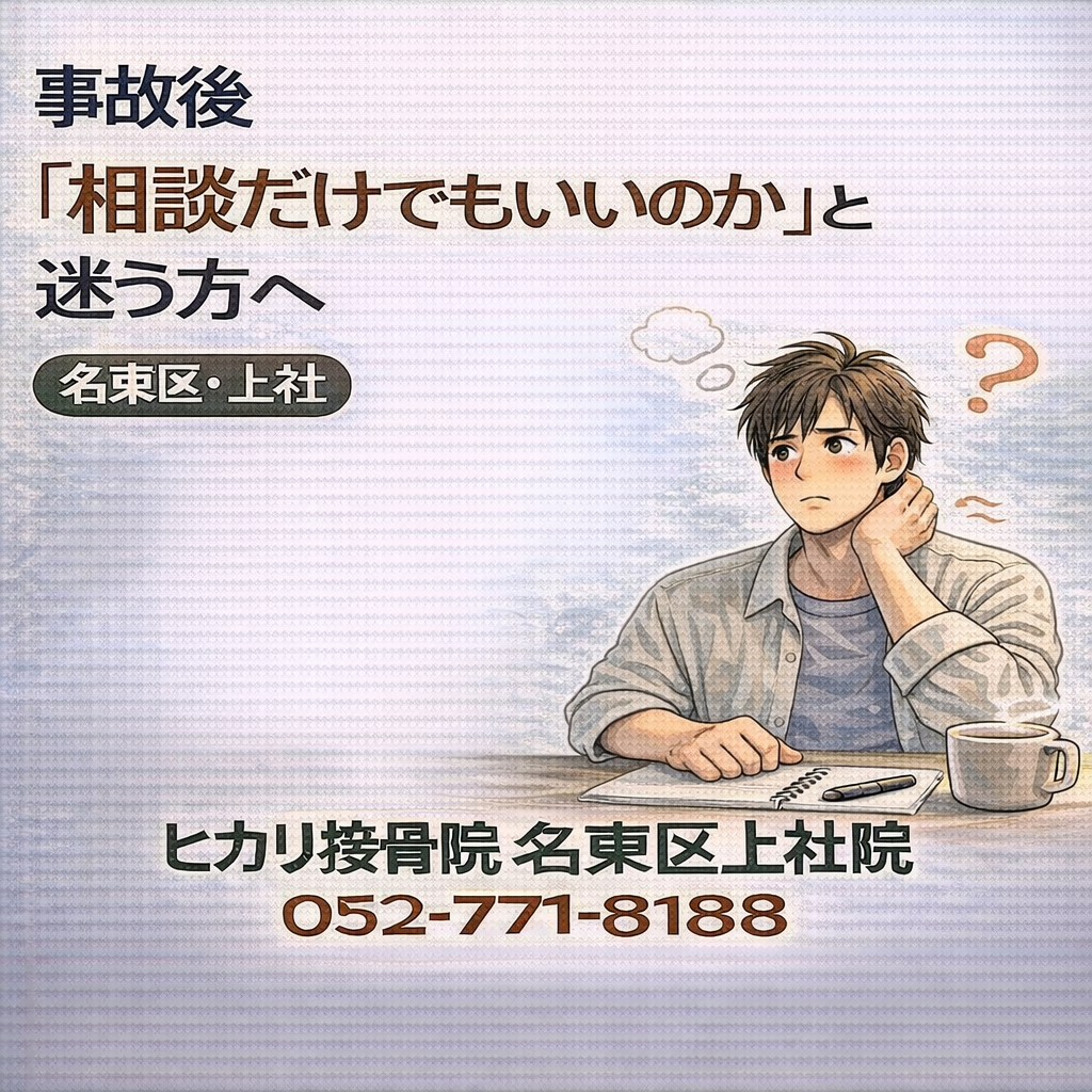 交通事故直後は問題を感じなくても、後から違和感が気になり始める方もいます。名東区・上社周辺でも多い段階で、今すぐ決めなくても、まず状況を整理してから次の判断を考えるという進め方があります。