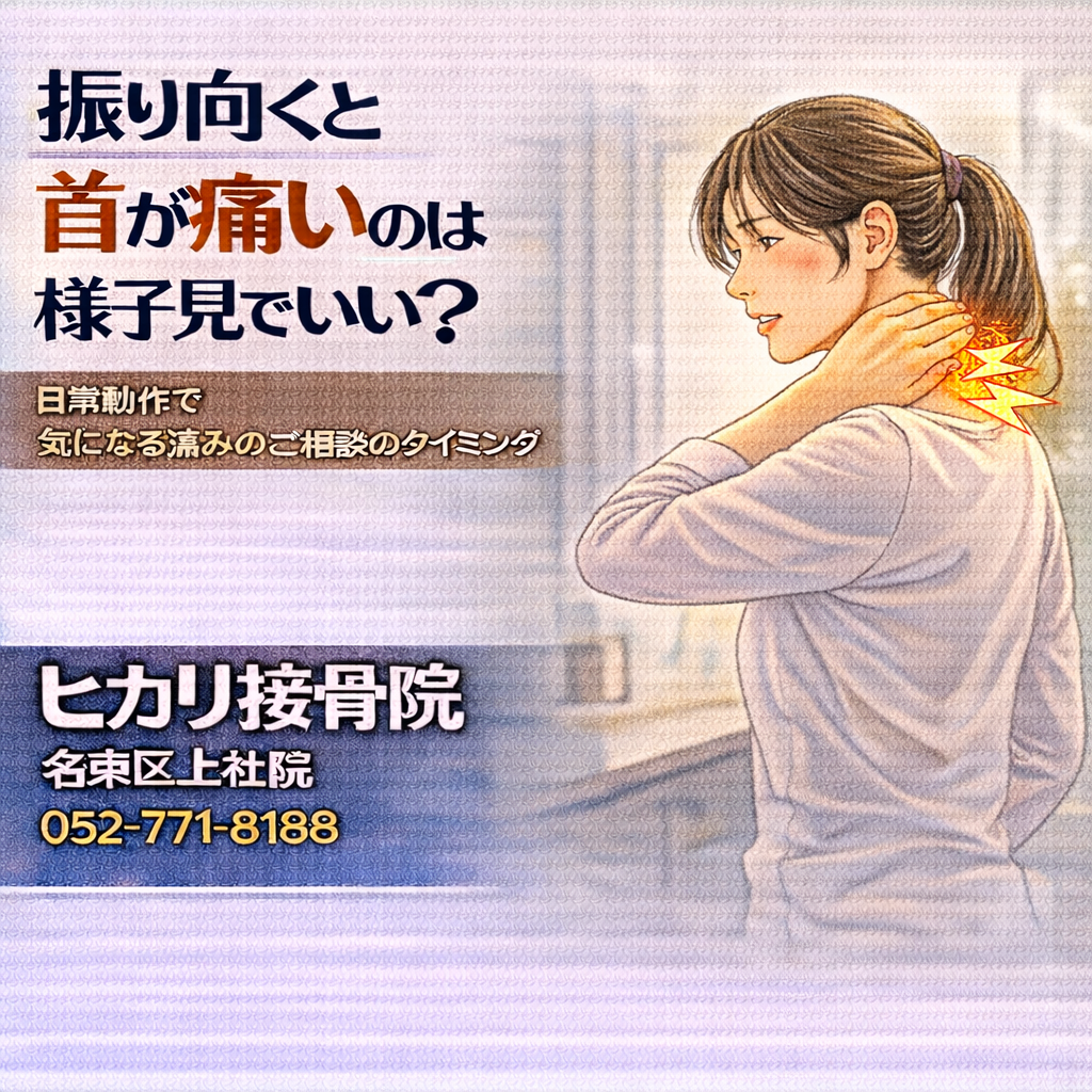 振り向くと首が痛い、車の後方確認や日常動作で違和感が出る。このまま様子を見ていいのか迷う方も多いです。名東区でも多いご相談として、首を動かす場面での負担と判断の目安を整理します。