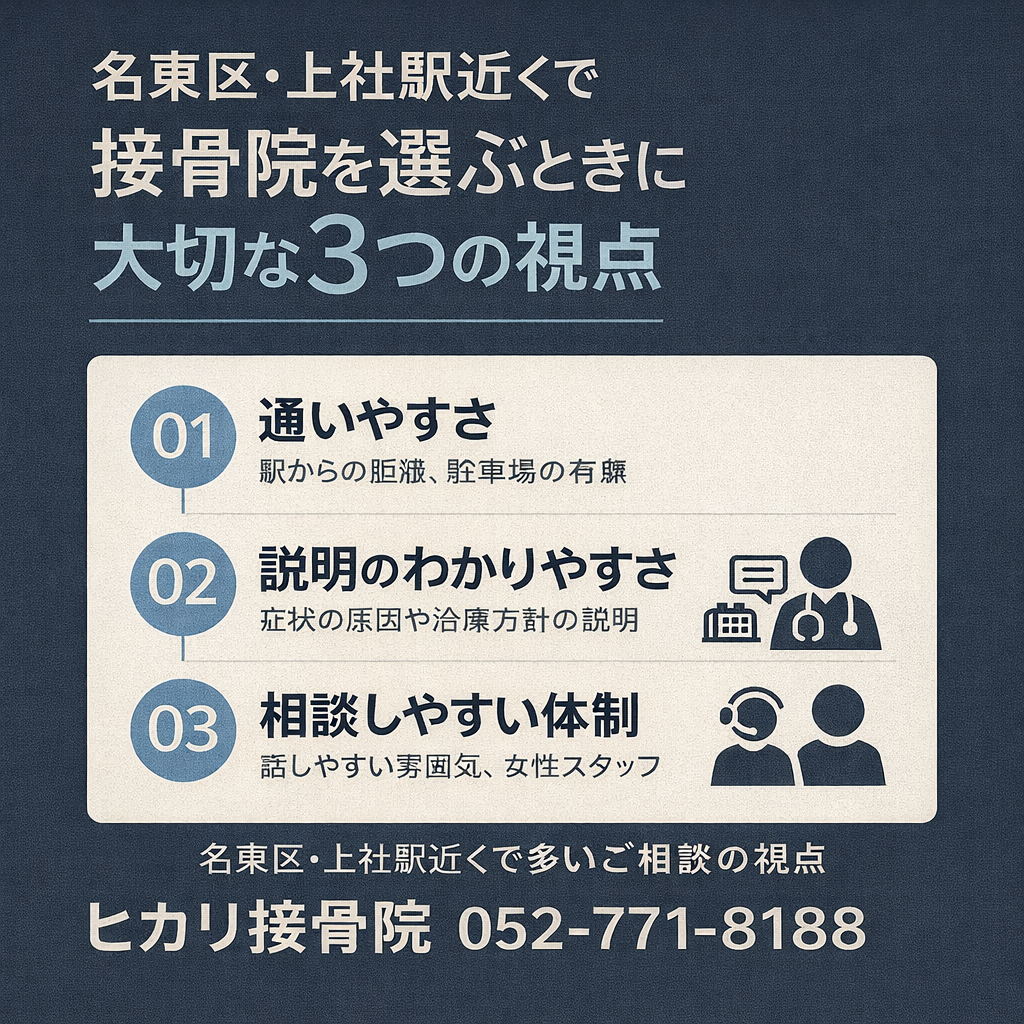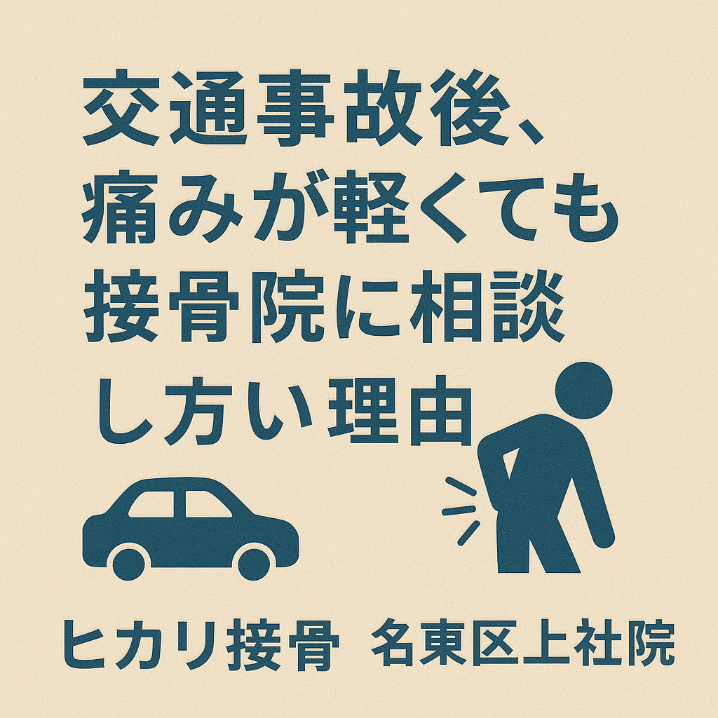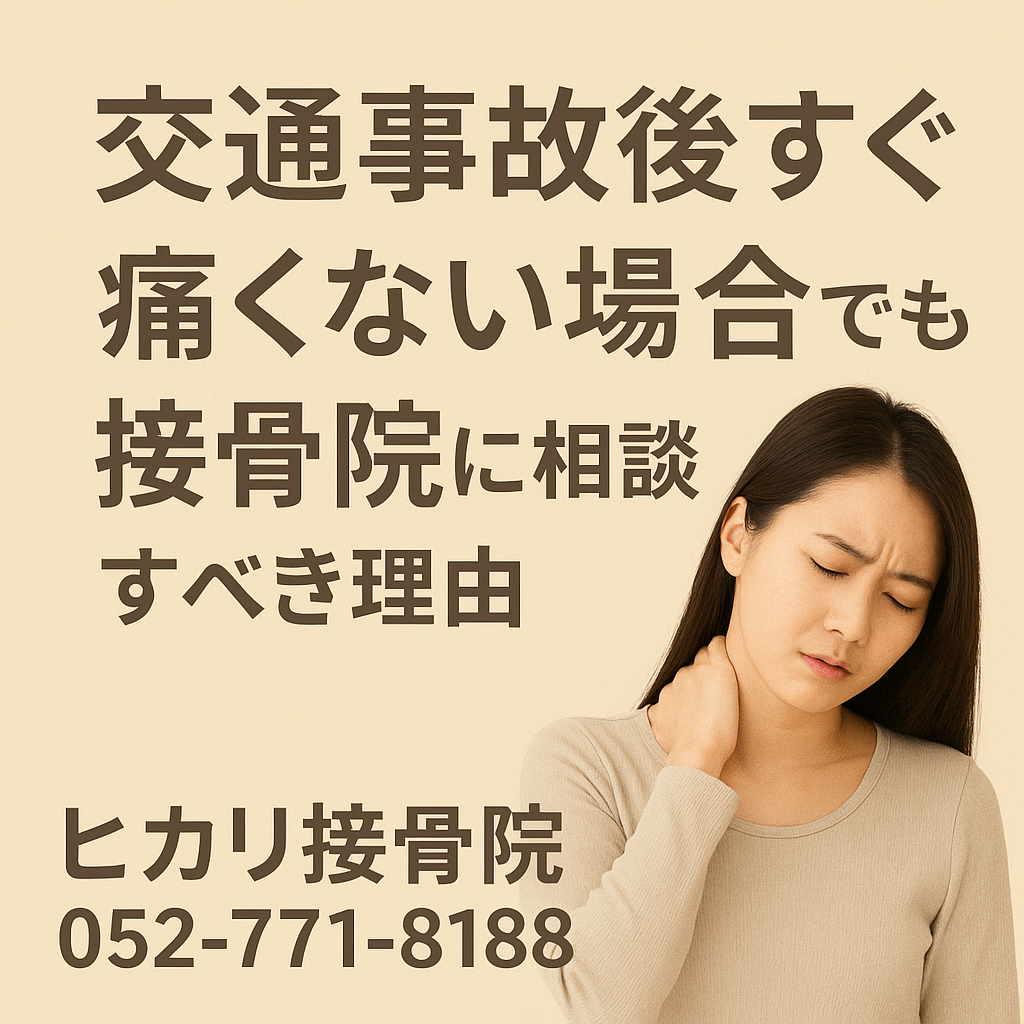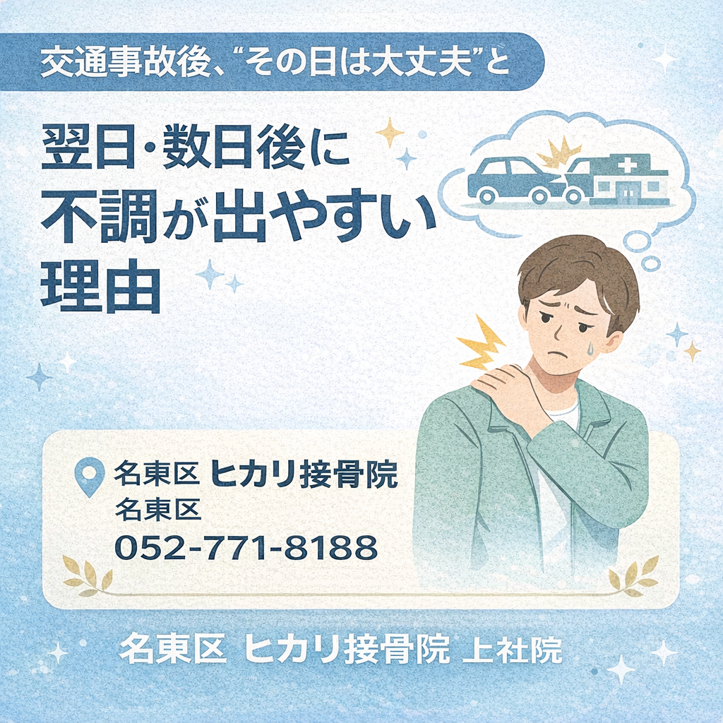 交通事故後、その日は痛みがなくても、翌日以降に首・腰・違和感が出るケースは名東区でも少なくありません。事故直後に接骨院へ相談しておくことが、後々の保険対応や施術継続で重要になる理由を解説します。