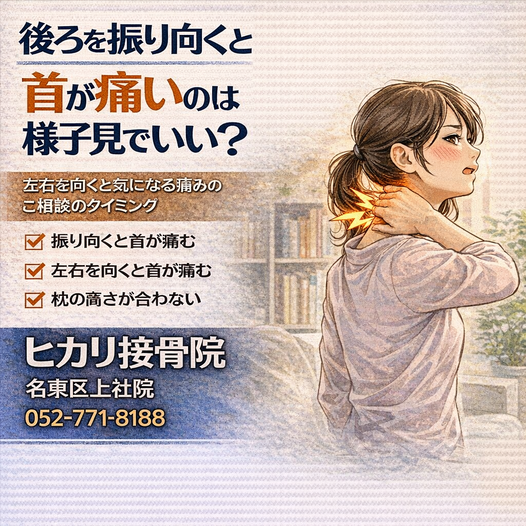 後ろを振り向くと首が痛い、左右を向くと違和感がある。このまま様子を見ていいのか迷う方もいます。名東区・上社でも多いご相談として、首の動きに関わる負担と判断の目安を整理します。