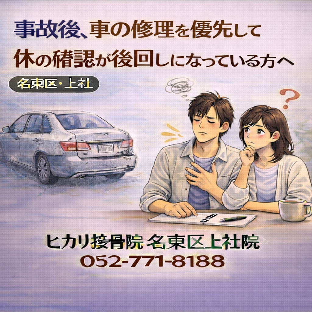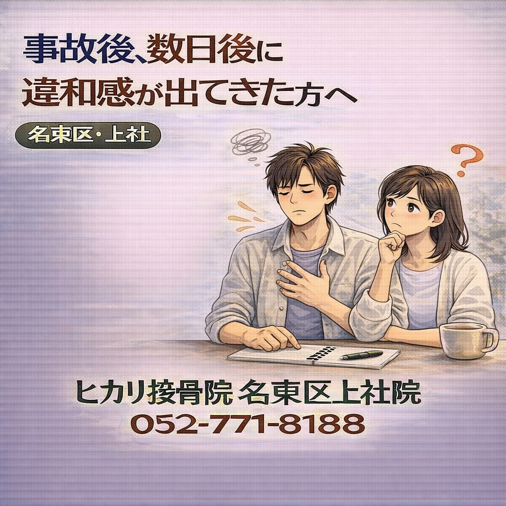 交通事故後、数日たってから違和感が出て迷う方もいます。名東区・上社周辺でもよくある段階で、すぐ通院を決めなくても、まず状況を整理してから次の判断を考えるという進め方があります。