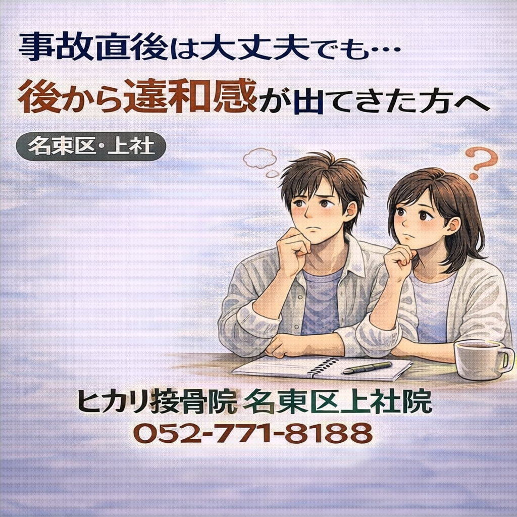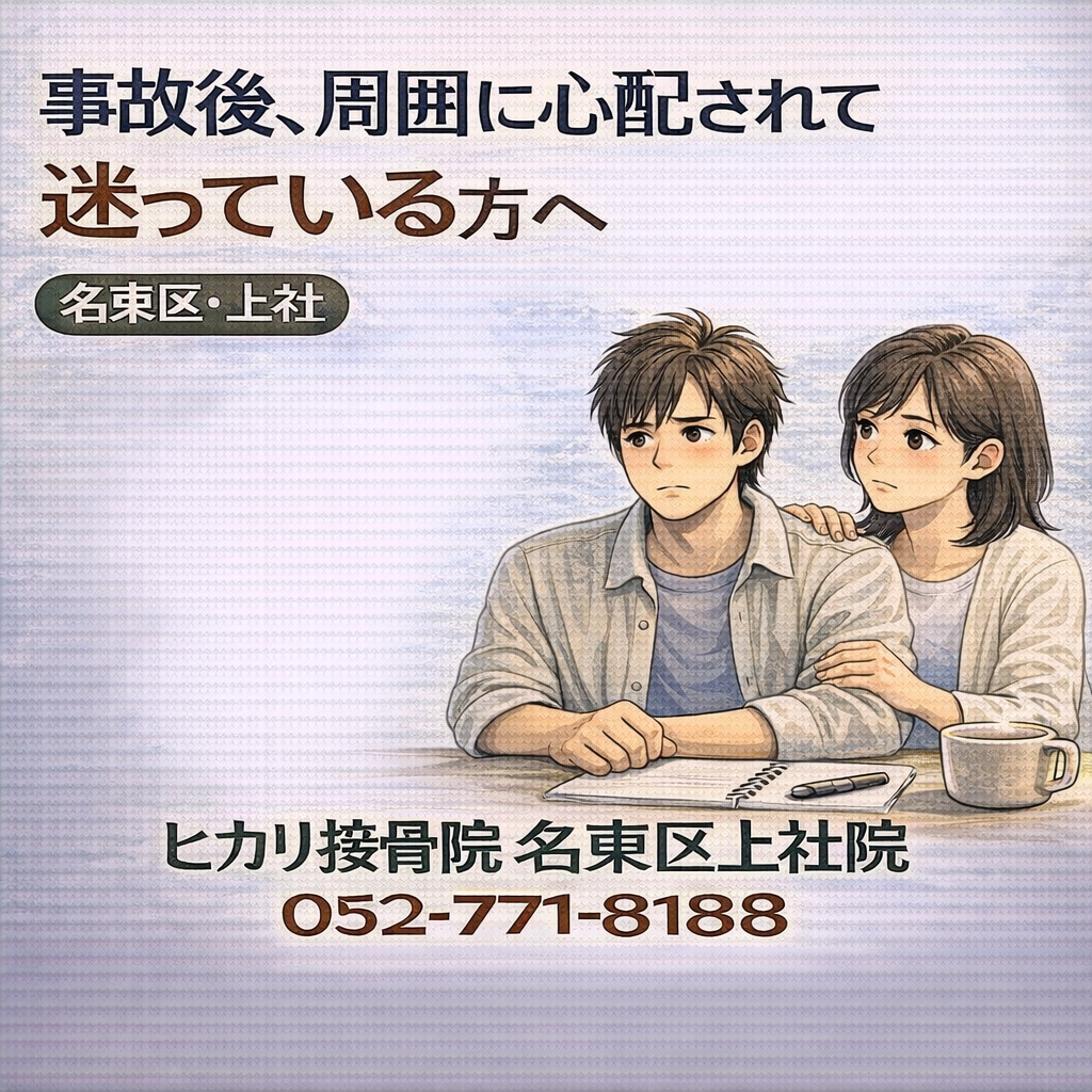 交通事故後、「通院するほどではないけど相談だけしていいのか」と迷う方もいます。名東区・上社周辺でも多い段階で、今すぐ通院を決めなくても、まず状況を整理してから次の判断を考えるという進め方があります。
