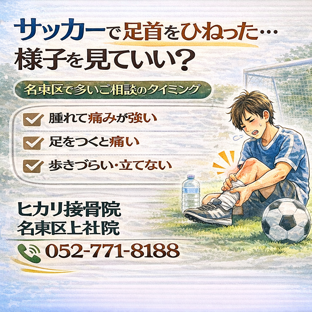 サッカー中に足首をひねってしまい、その後の痛みで様子を見るべきか迷う方もいます。名東区・上社周辺でも多いご相談で、まず今の状態を整理することが判断の目安になります。