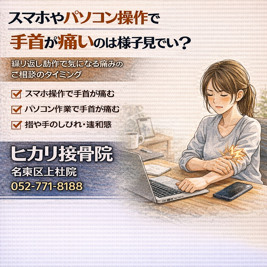 スマホ操作やパソコン作業で手首が痛い、繰り返し動作で違和感が出る。このまま様子を見ていいのか迷う方もいます。名東区・上社でも多いご相談として、手首にかかる負担と判断の目安を整理します。