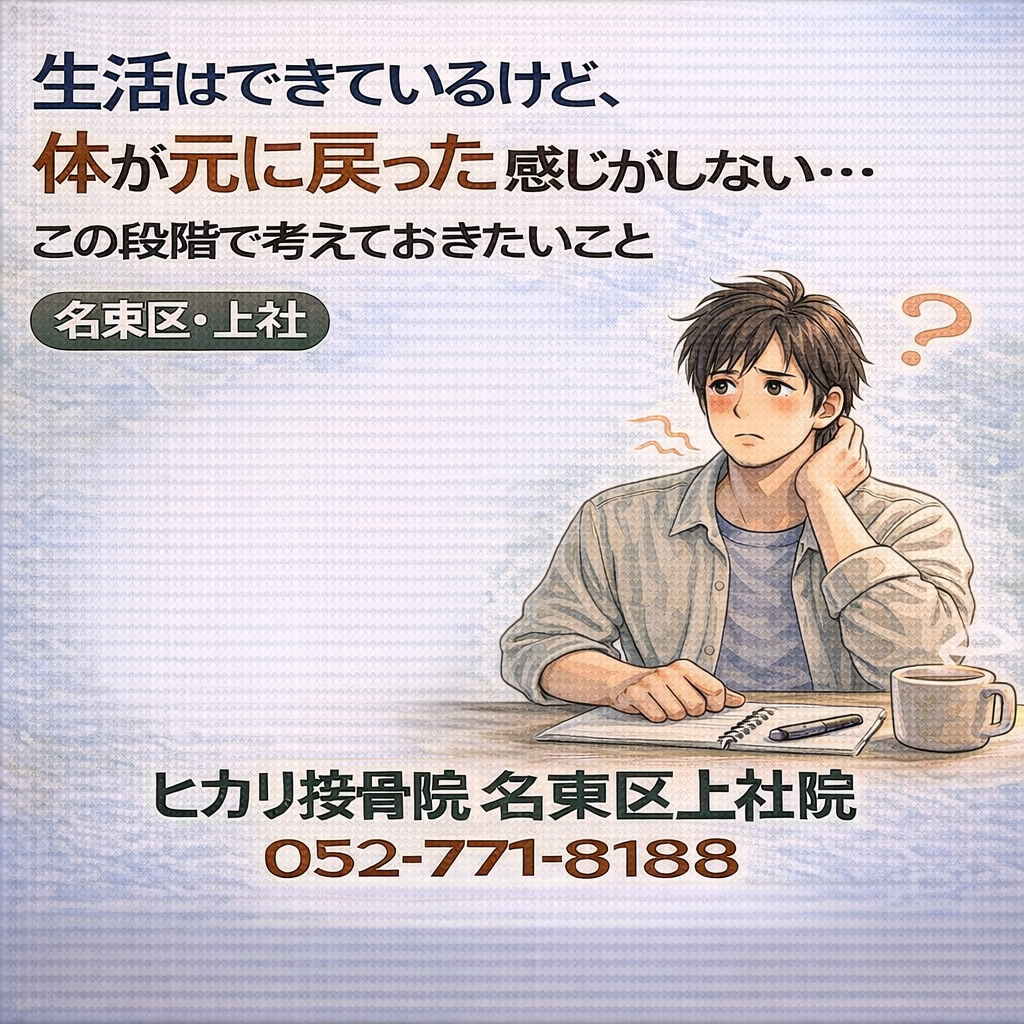 交通事故後、日常生活は送れているものの「完全に元に戻った感じがしない」と違和感が残る方もいます。名東区・上社周辺でも多い段階で、今すぐ決めなくても、状況を整理してから次を考えるという進め方があります。