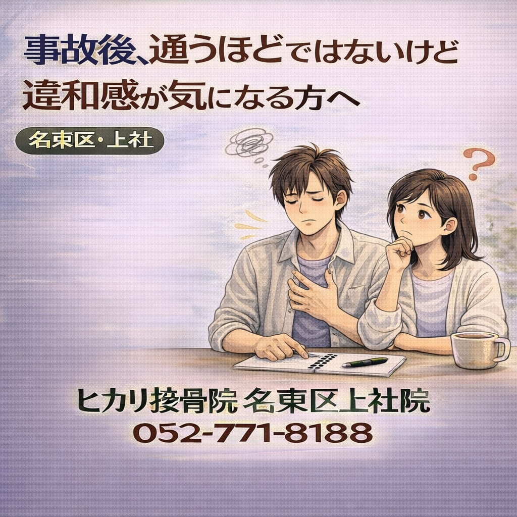 交通事故後、強い痛みはないものの「通うほどではないかも」と迷う方もいます。名東区・上社周辺でもよくある段階で、すぐ通院を決めなくても、まず状況を整理してから次の判断を考えるという進め方があります。
