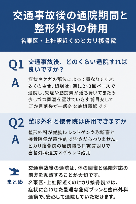 名東区・上社駅近くのヒカリ接骨院では、交通事故後の首・腰・肩の不調に合わせた施術をご提案しています。整形外科との併用にも対応し、通院期間の目安や保険会社への連絡なども丁寧にサポートします。安心して通院できる環境づくりを大切にしています。