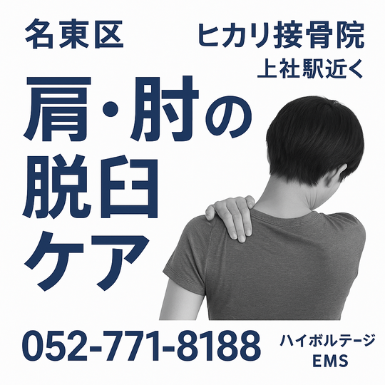名東区・上社駅近くのヒカリ接骨院では、肩の脱臼や肘の脱臼(肘内障)による体のお悩みに対応。日曜施術・一人施術で丁寧にサポートし、ハイボルテージやEMSを使用した施術も可能。整形外科との連携も行い、安心して相談できる環境を整えています