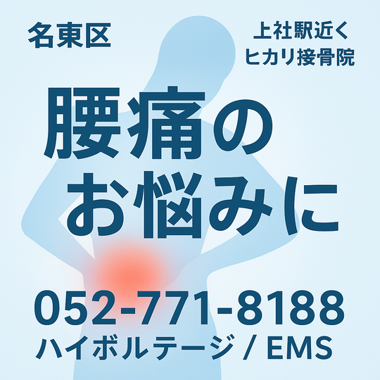 名東区・上社駅近くで腰のつらさにお悩みの方は、ヒカリ接骨院(052-771-8188)へ気軽にご相談ください。