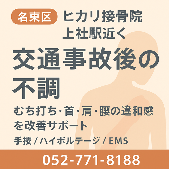 交通事故後の不調は、「そのうち良くなるだろう」と放置してしまうと違和感が長引くこともあります。名東区で交通事故後のケアを必要としている方は、一度ヒカリ接骨院 上社院へご相談ください。