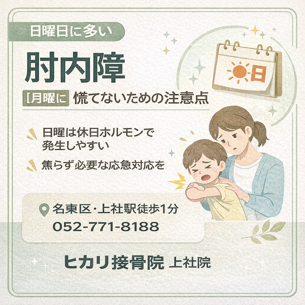 日曜日に多い肘内障のご相談について、名東区・上社駅近くのヒカリ接骨院 上社院が一般的な注意点を解説。月曜の朝に慌てないために知っておきたいポイントをまとめました。