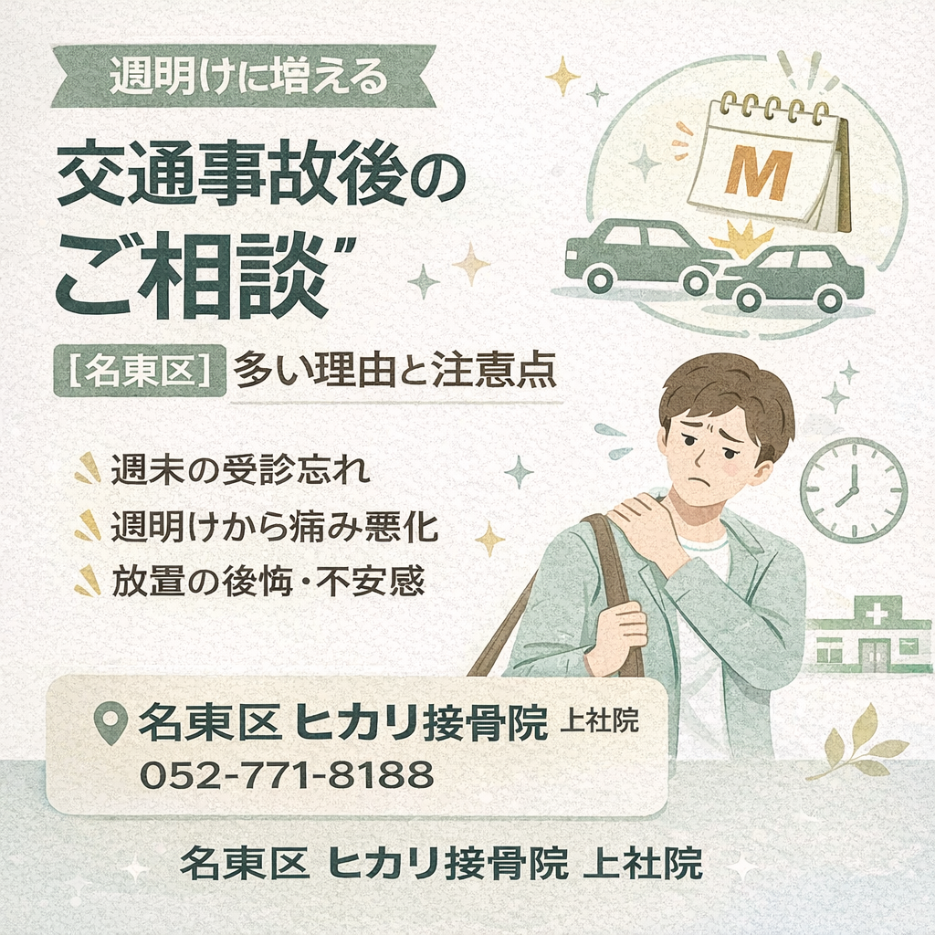 名東区にあるヒカリ接骨院 上社院には、事故後のお客様から「最初は平気だったのに、数日してから首や腰がつらくなってきた」というご相談が多く寄せられます。事故直後は緊張や興奮状態で、体の違和感を感じにくいこともあり、時間が経過してから徐々に不調が出るケースが少なくありません。