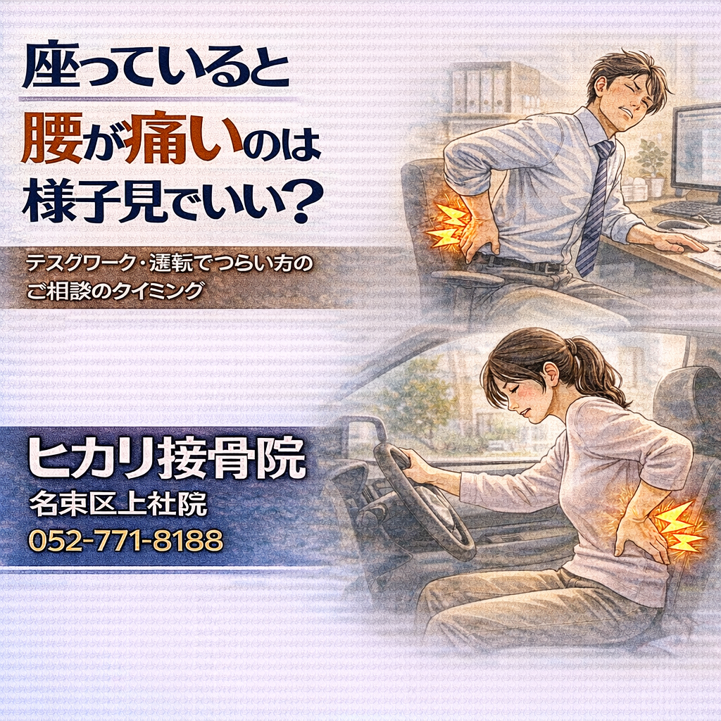 座っていると腰が痛い、デスクワークや運転で長時間同じ姿勢が続くとつらい。このまま様子を見ていいのか迷う方も多いです。名東区でも多いご相談として、座る姿勢による負担と判断の目安を整理します。